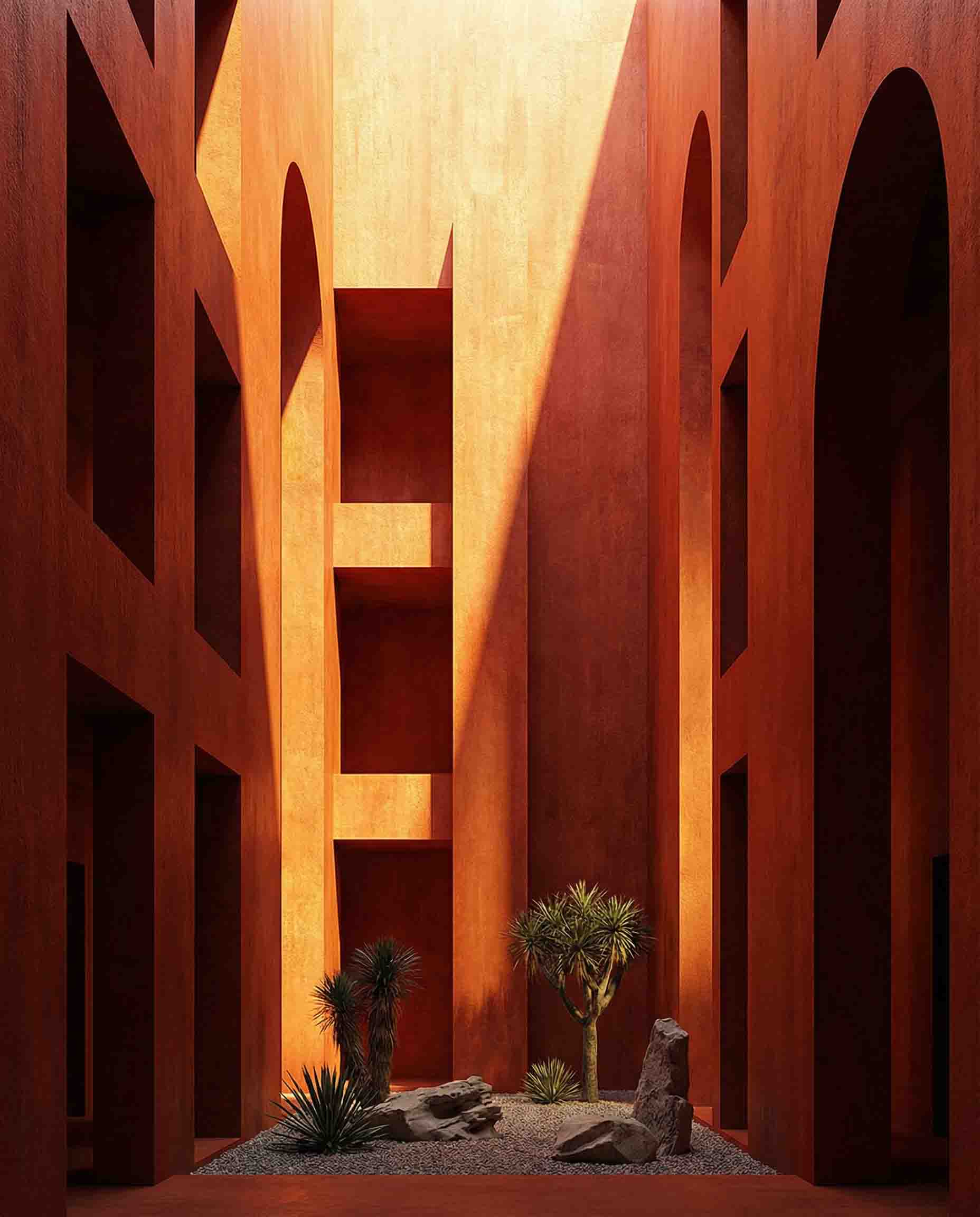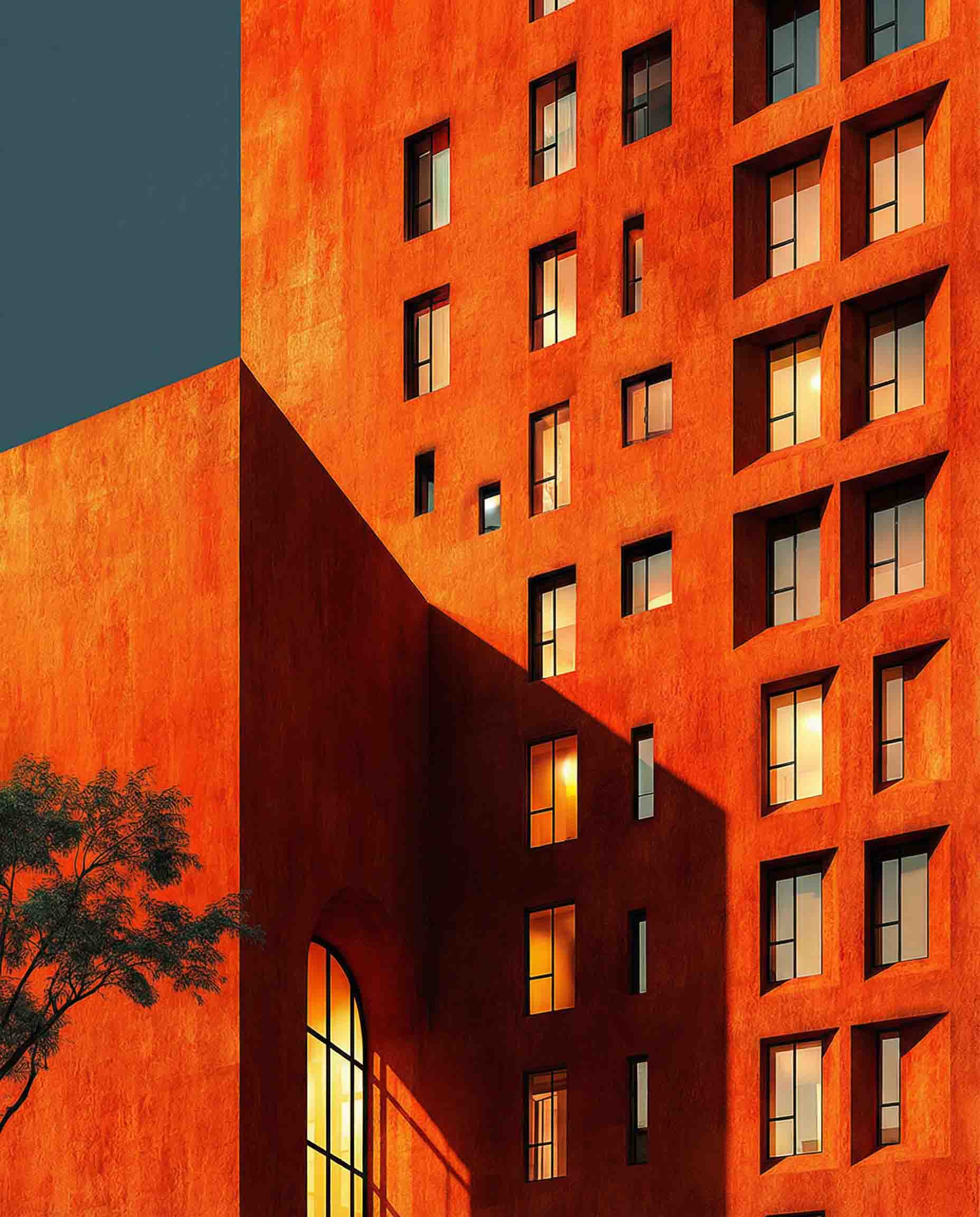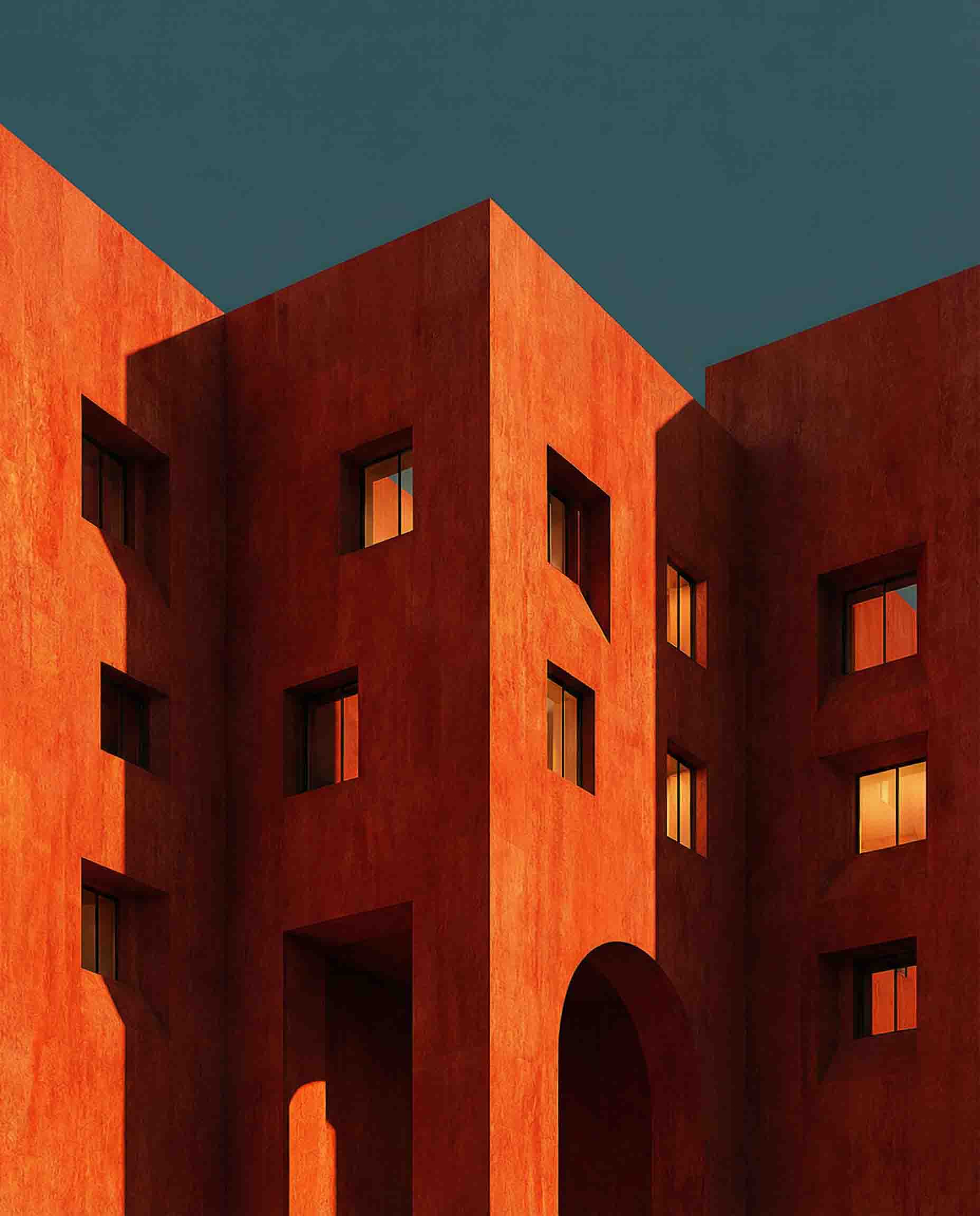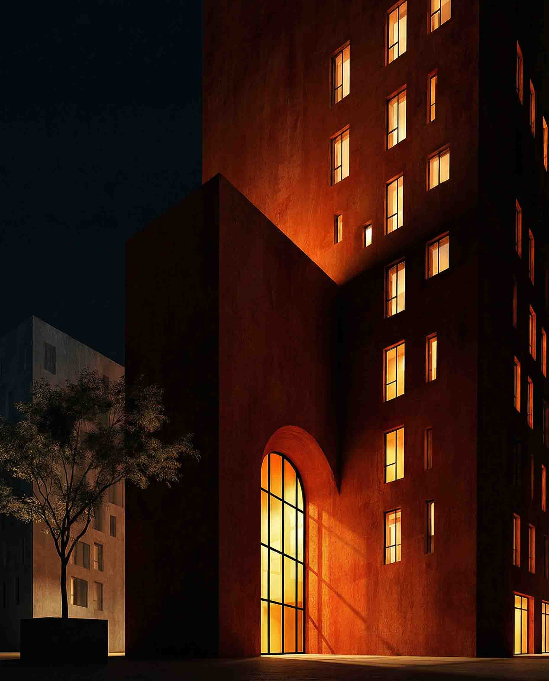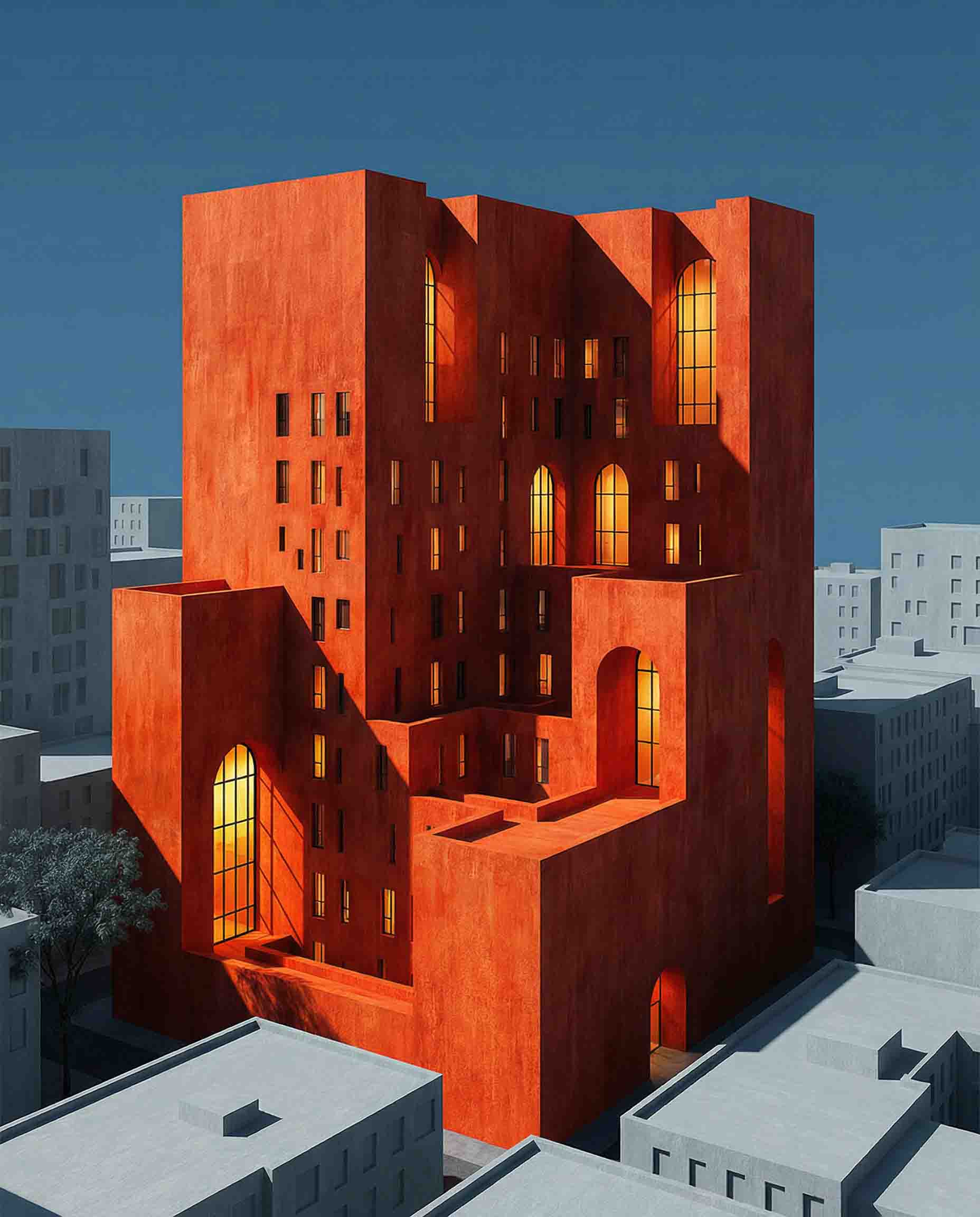 Ember Monolith Residence is a monolithic red-earth urban project shaped by carved openings, textured plaster surfaces, and dramatic natural light. It combines architectural austerity with emotional warmth, creating a strong identity rooted in shadow, material depth, and sculpted voids.