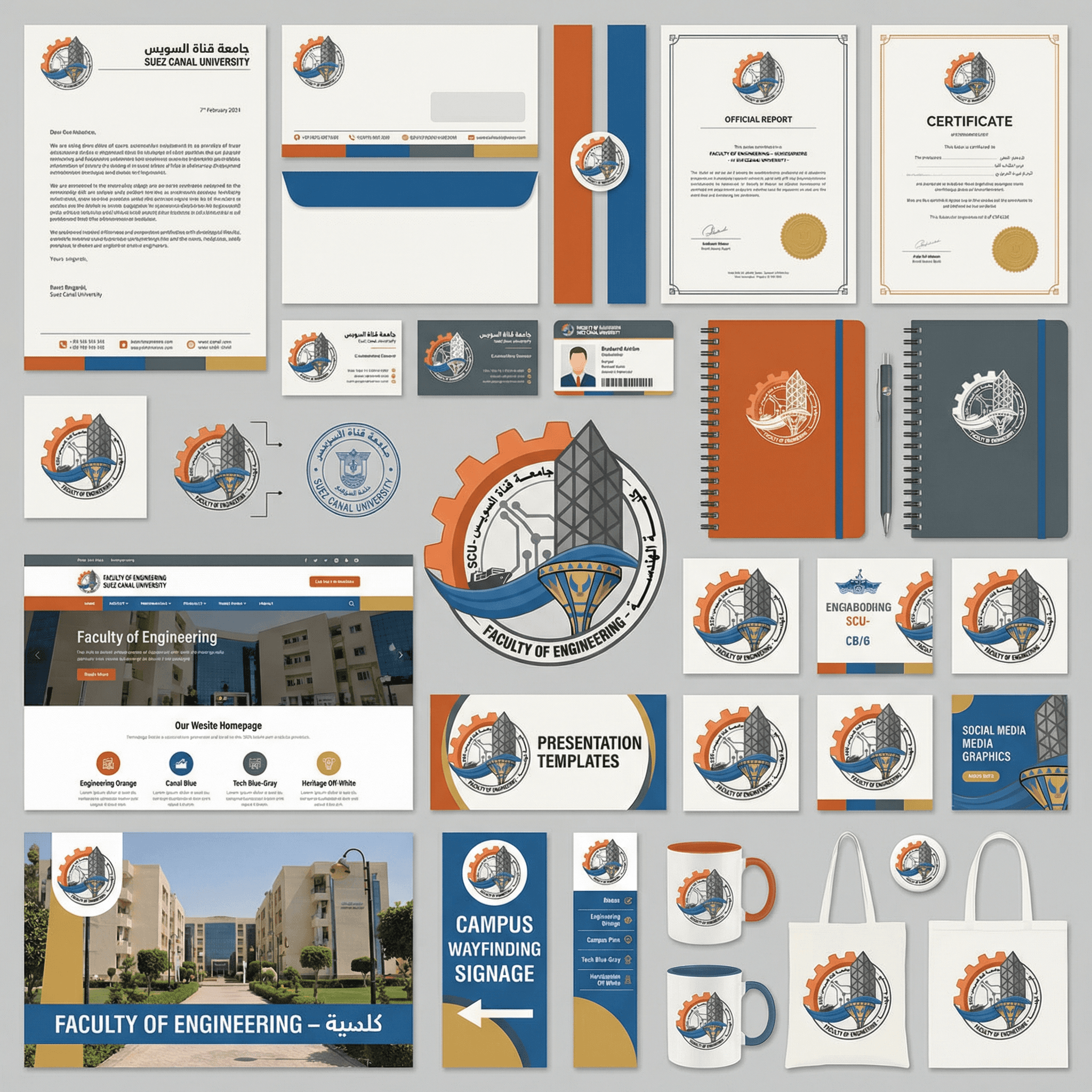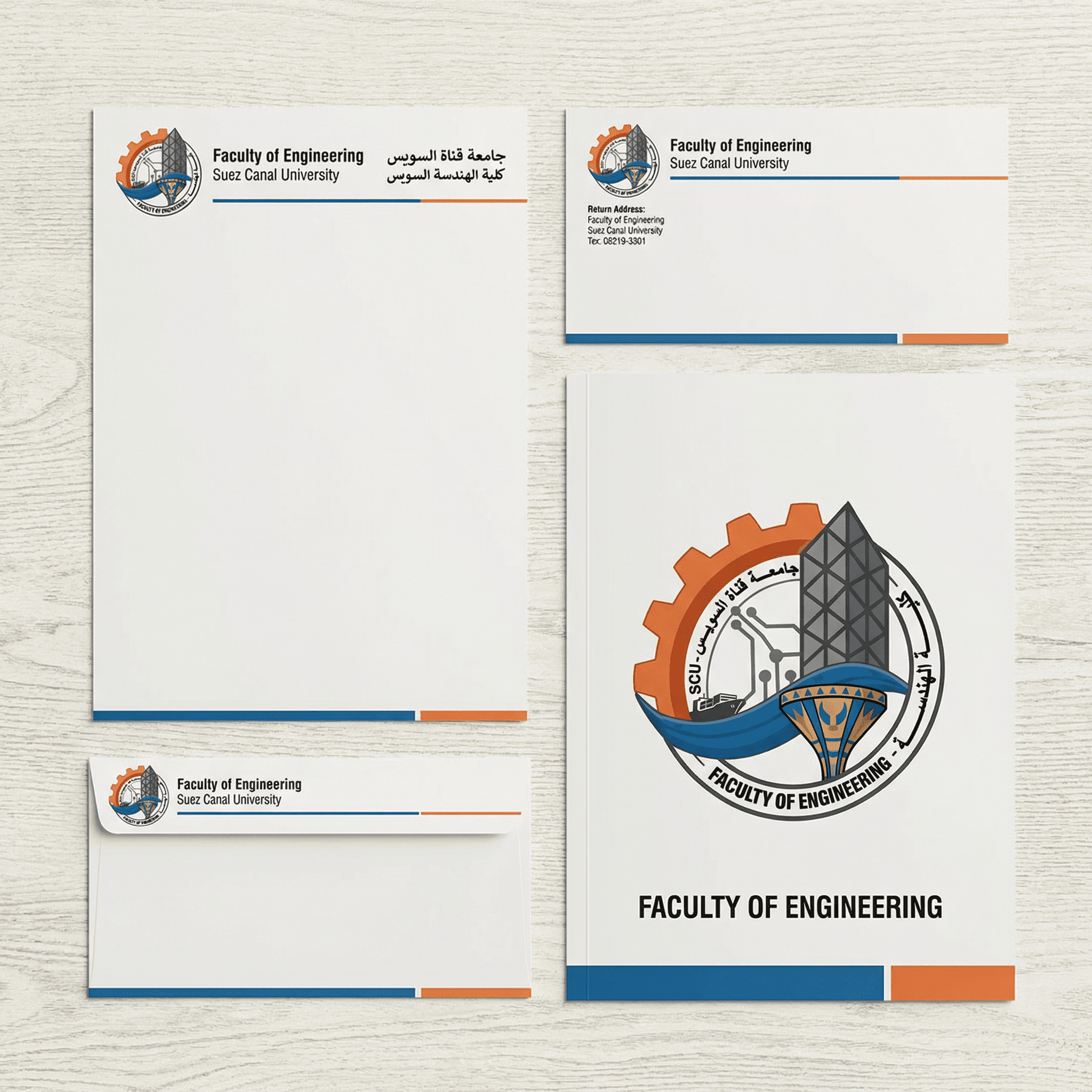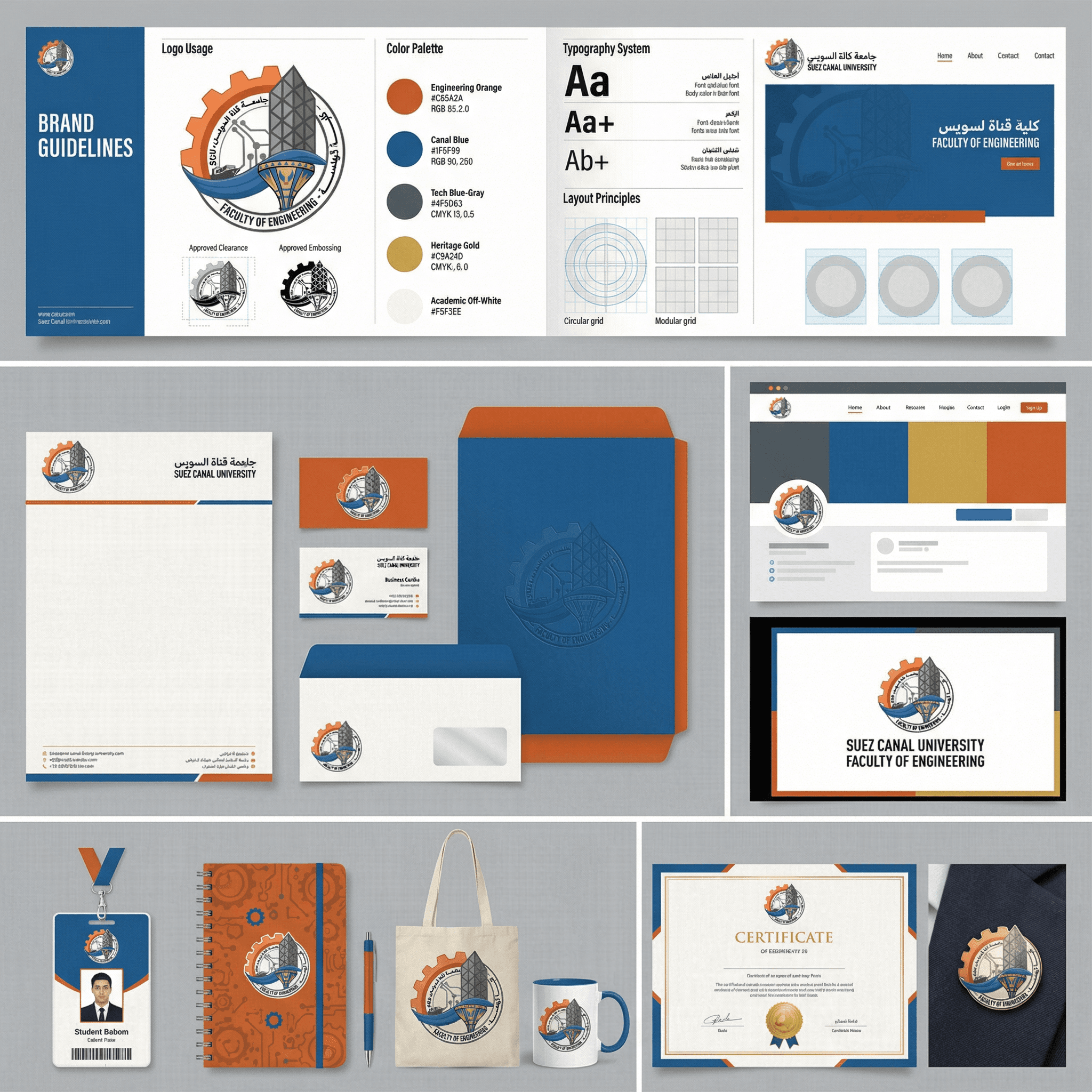 This project presents a complete brand identity system for the Faculty of Engineering at Suez Canal University. The objective was to create a visual identity that reflects academic credibility, engineering discipline, and cultural heritage.
