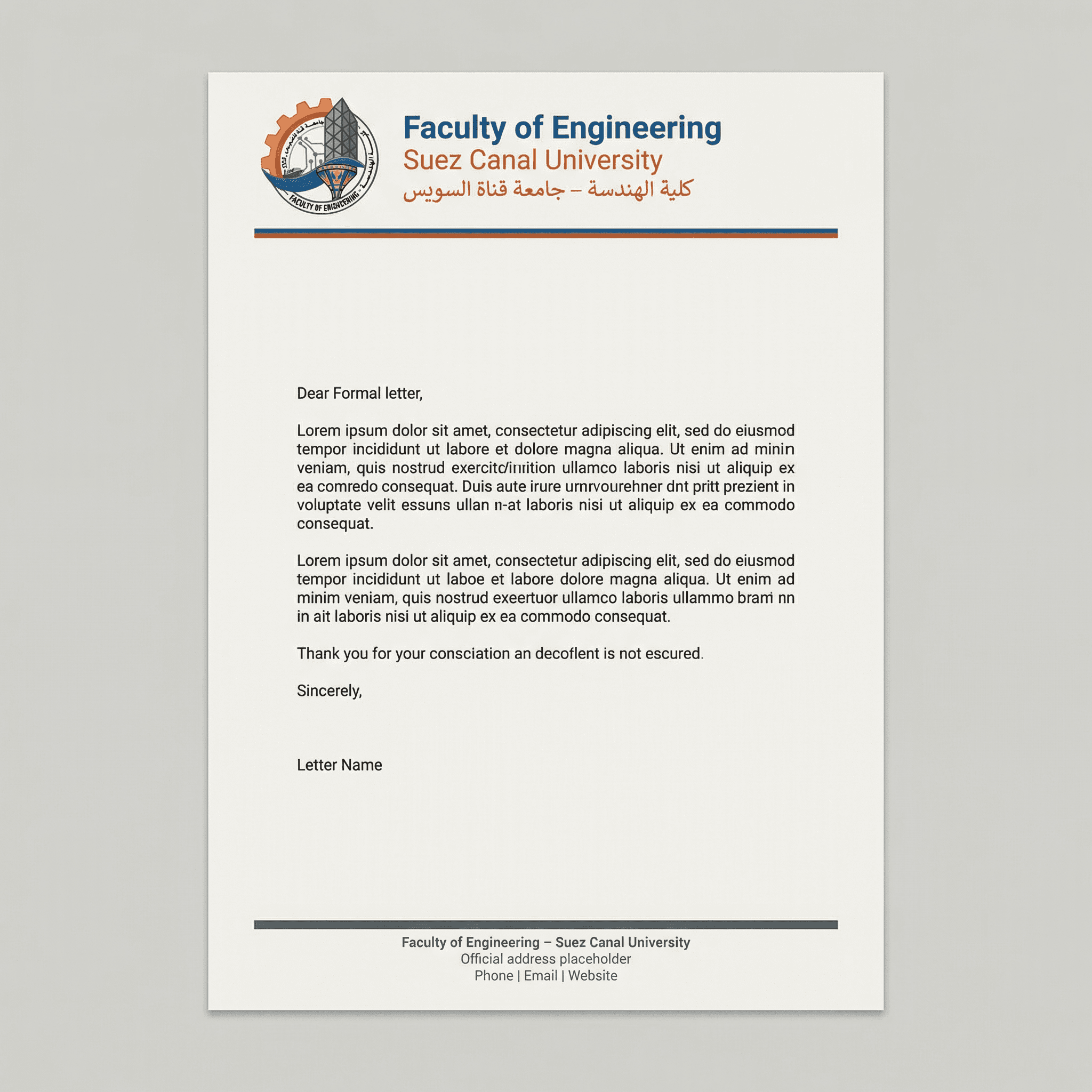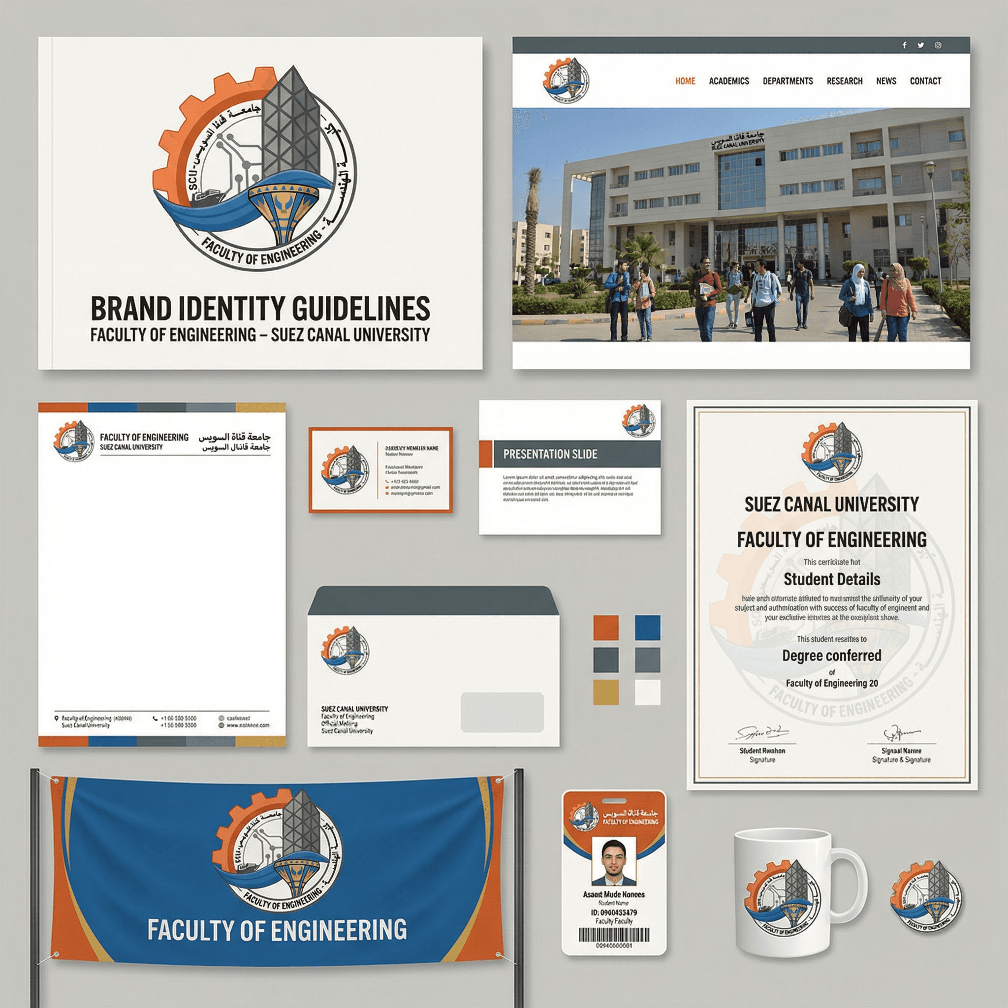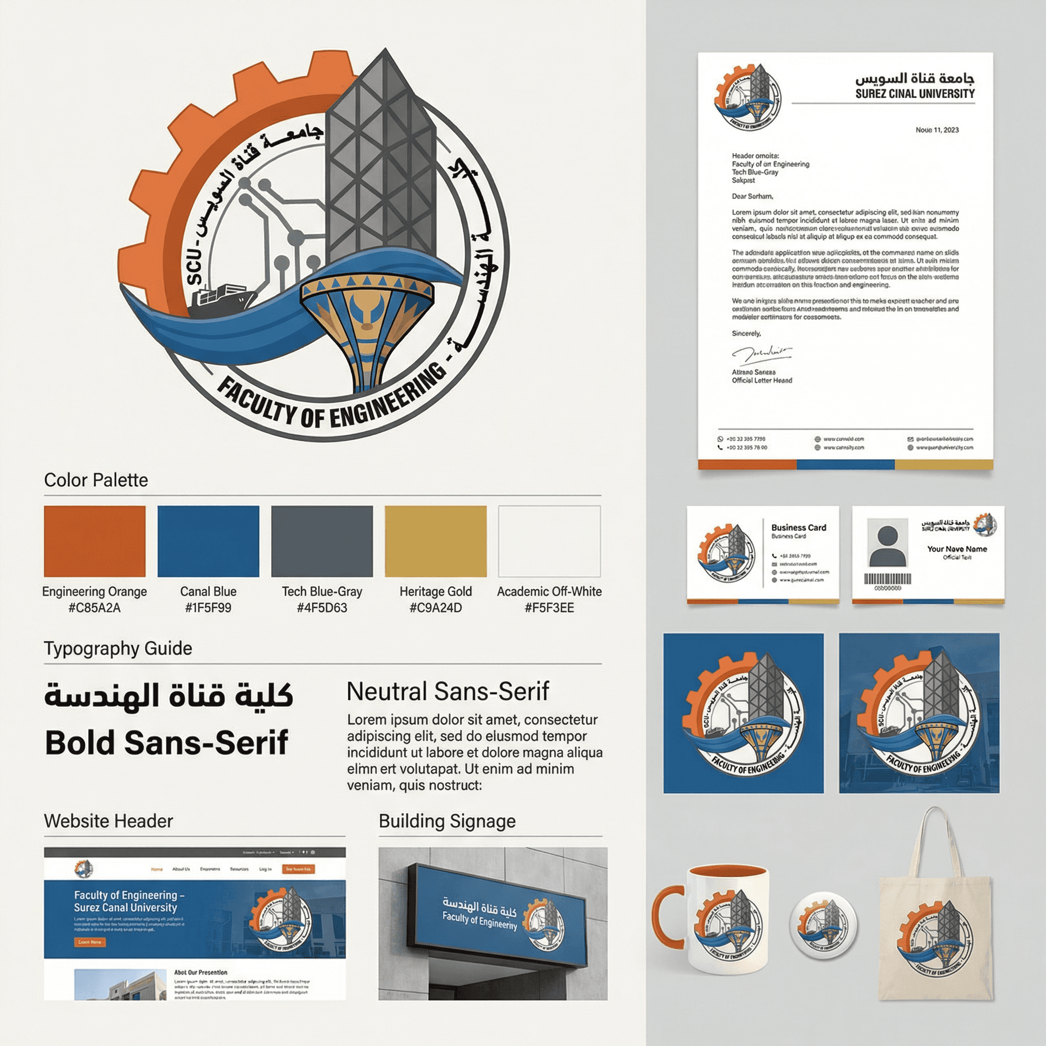 This project presents a complete brand identity system for the Faculty of Engineering at Suez Canal University. The objective was to create a visual identity that reflects academic credibility, engineering discipline, and cultural heritage.
