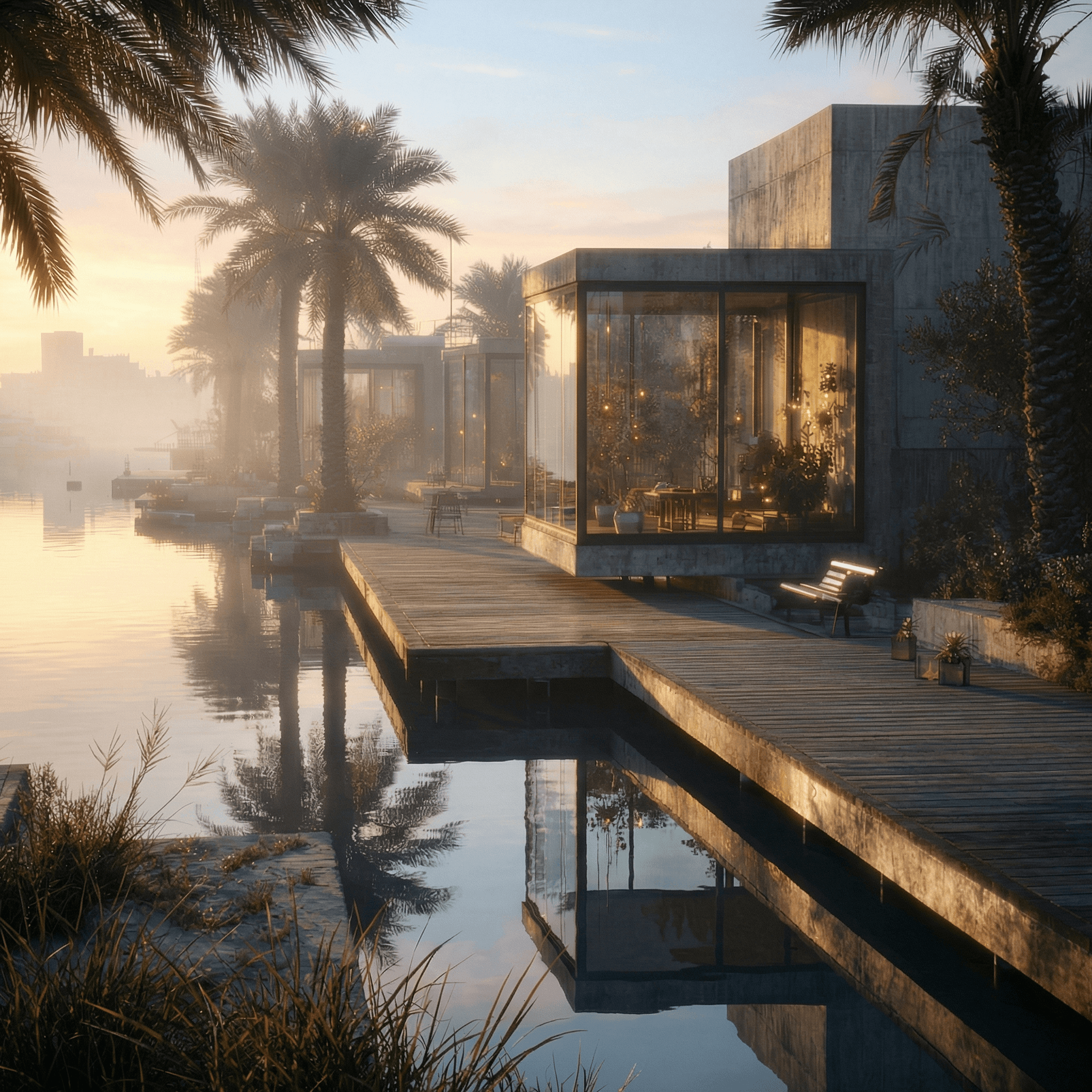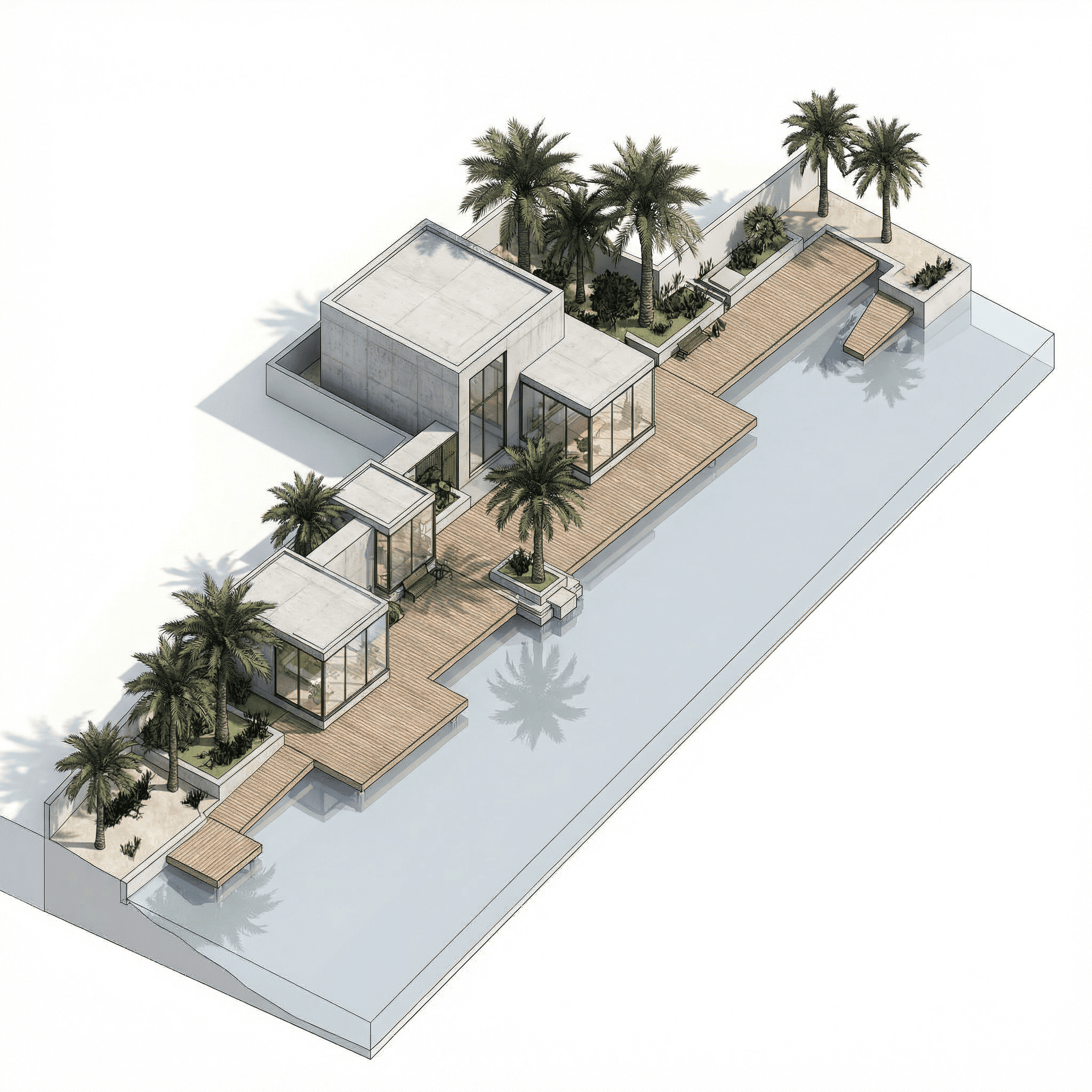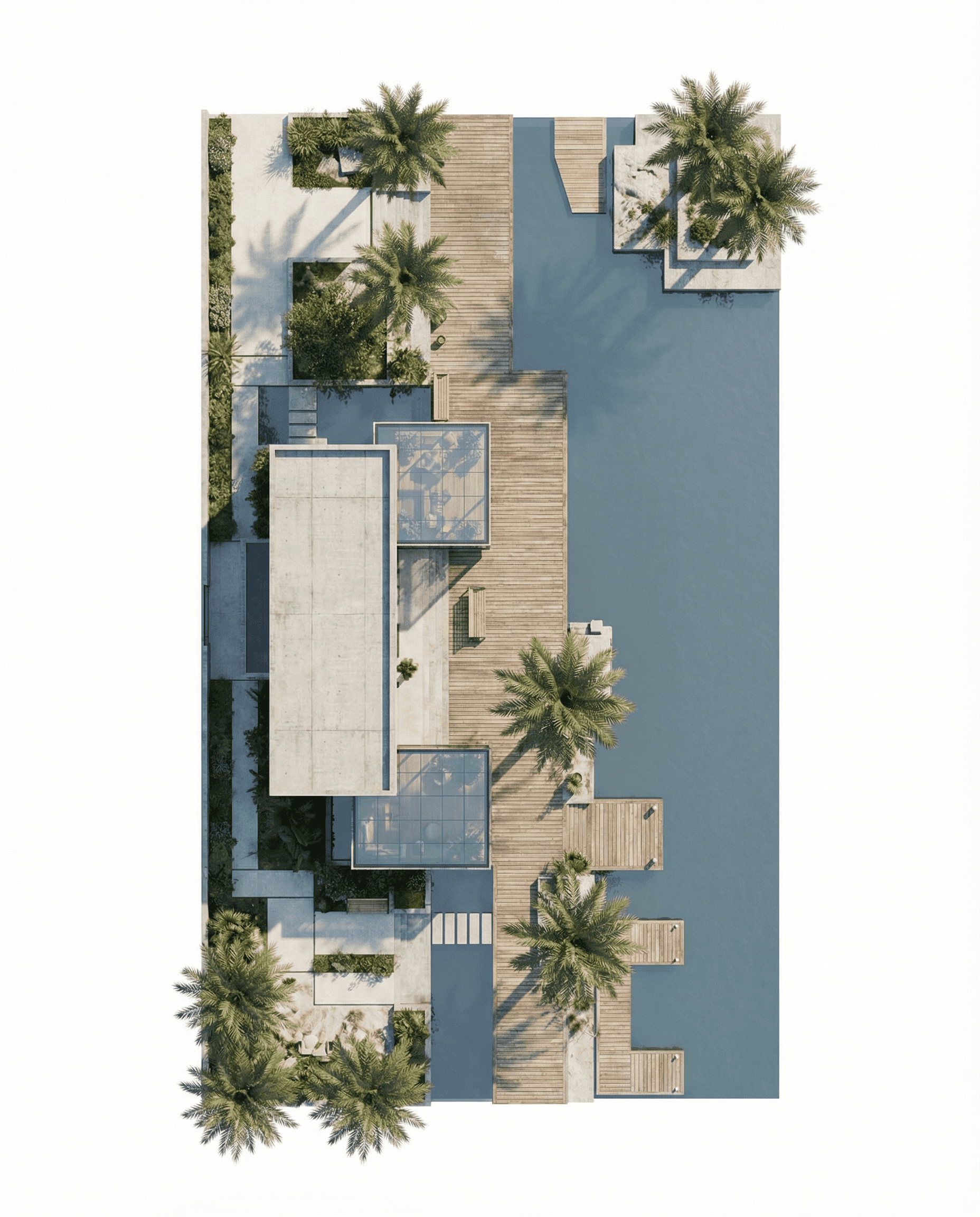 This project explores a minimalist architectural language applied to a waterfront setting, where solid and transparent elements are carefully balanced. The main structure is composed of rectilinear exposed concrete volumes intersected by fully glazed spaces, creating a strong visual contrast while maintaining openness toward the landscape.