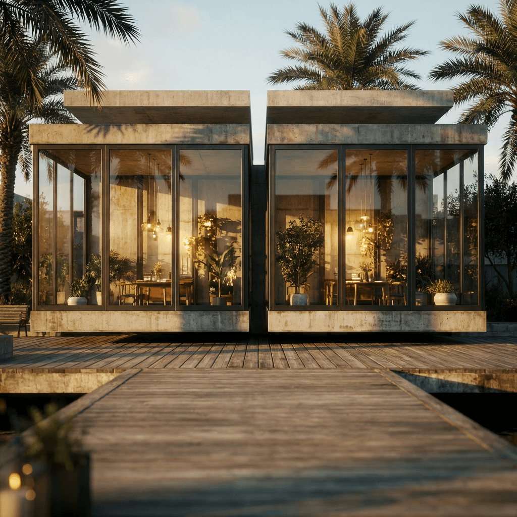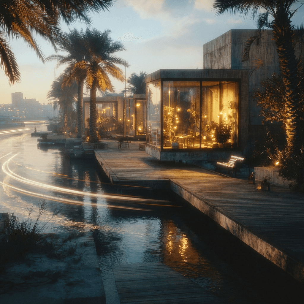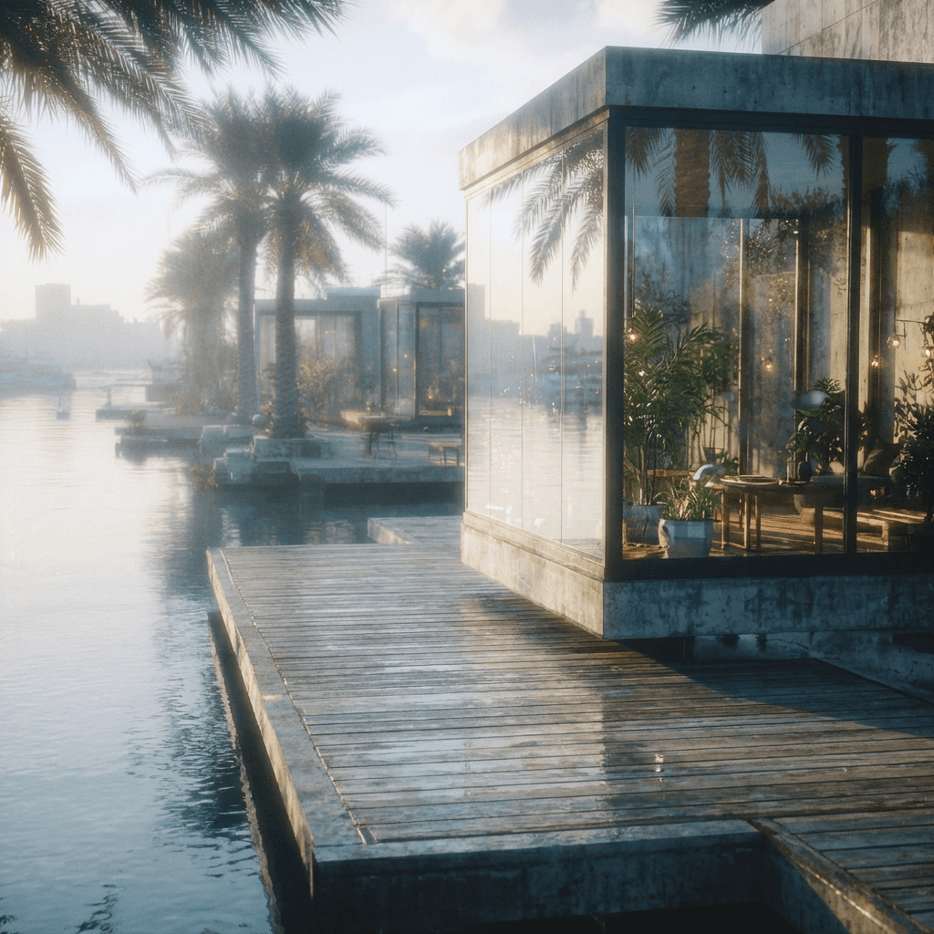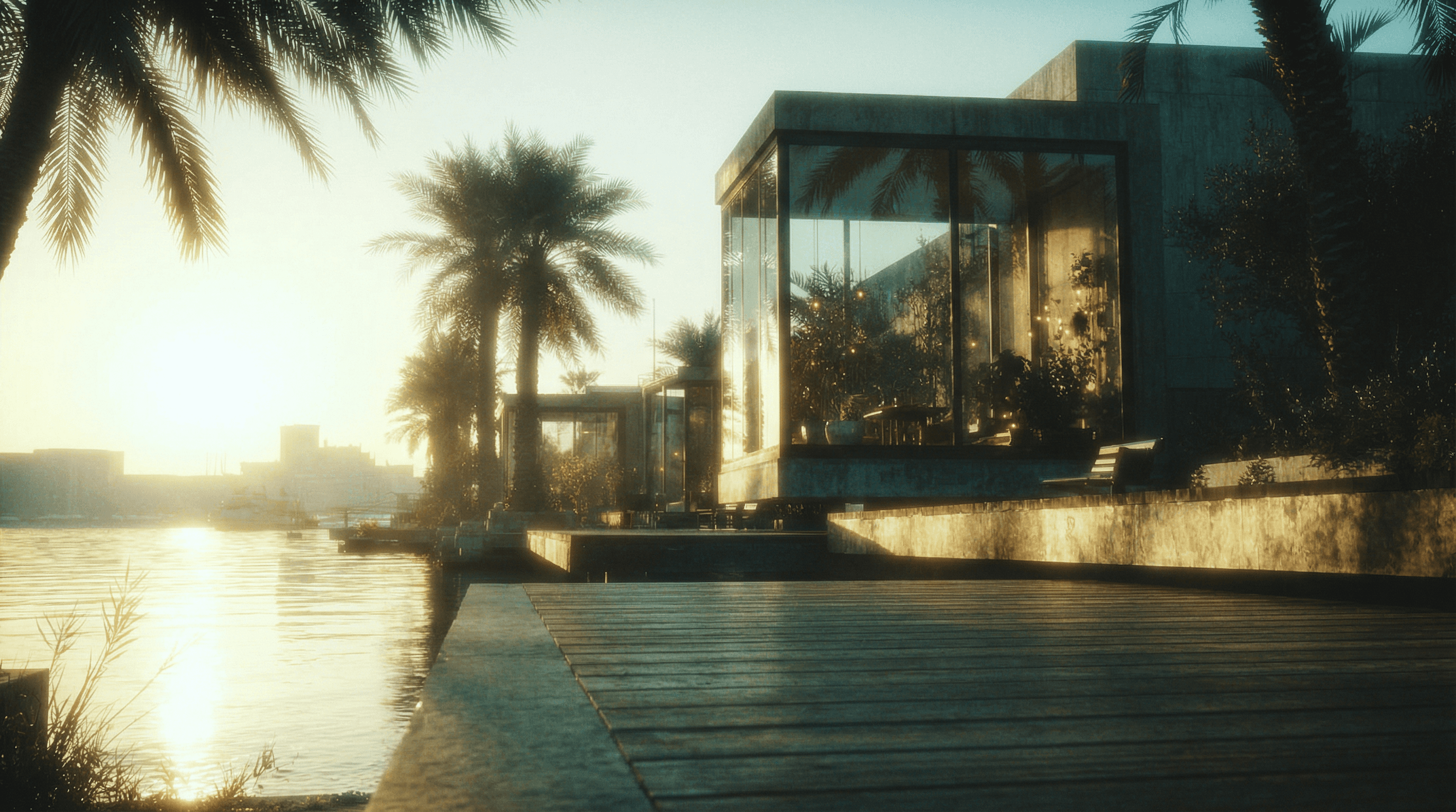 This project explores a minimalist architectural language applied to a waterfront setting, where solid and transparent elements are carefully balanced. The main structure is composed of rectilinear exposed concrete volumes intersected by fully glazed spaces, creating a strong visual contrast while maintaining openness toward the landscape.