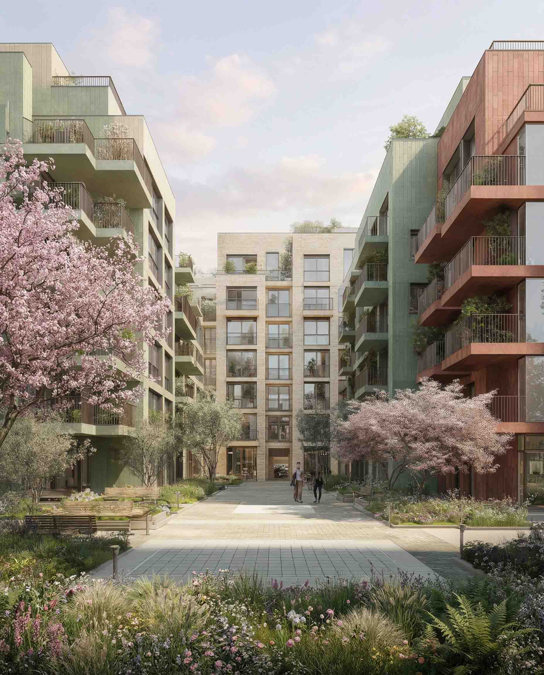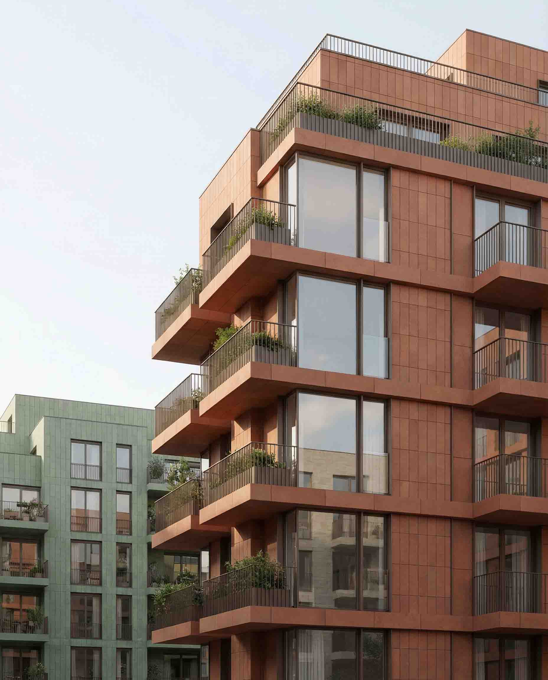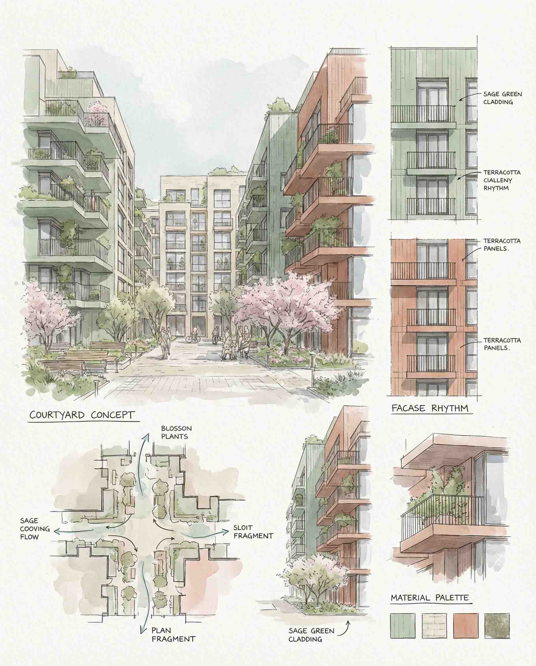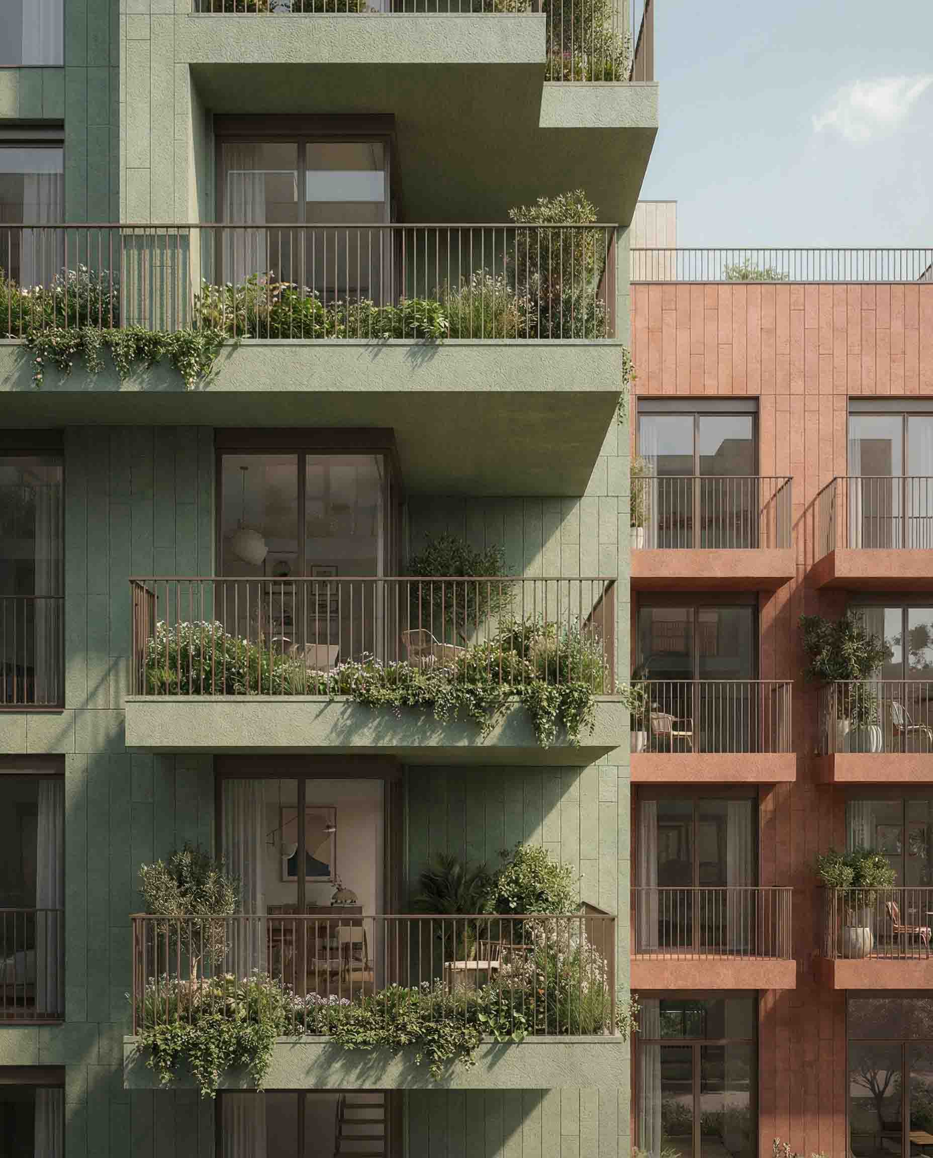 Verde Terracotta Courtyard is a contemporary residential development centered around a landscaped communal courtyard, combining sage-green and terracotta façades, planted balconies, and soft public-private transitions to create a calm, high-quality urban living environment.